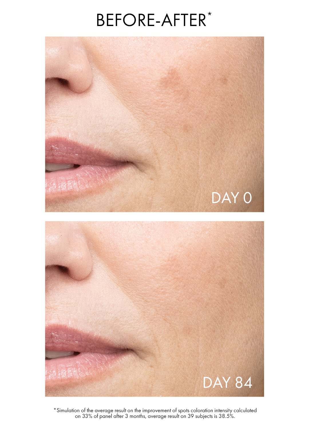 *Simulación del resultado promedio en la mejora de la intensidad de la coloración de las manchas calculado en el 33% del panel después de 3 meses, resultado promedio en 39 sujetos es -38.5%, en condiciones normales de uso. Los resultados pueden variar de un individuo a otro.