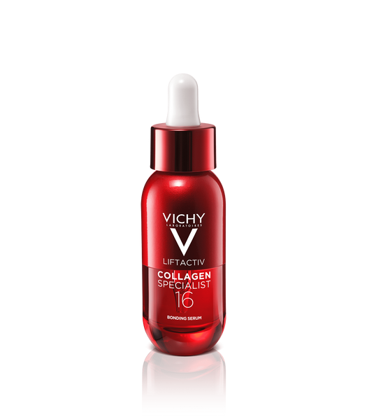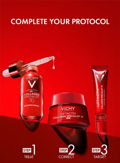 Corrige 16 signos de la edad* y mejora las arrugas, las líneas de expresión, la firmeza, la elasticidad, la flacidez, el aspecto liso, la textura de la piel, la tonicidad, la densidad, la resistencia, la apariencia de los poros, la luminosidad, la suavidad, la flexibilidad, la hidratación y la uniformidad del tono. Para todo tipo de piel. Vichy Serum Collagen Specialist 16 no se centra únicamente en uno o dos signos de la edad; adopta un enfoque integral que aborda 16 de ellos, garantizando una piel visiblemente más suave, tersa y radiante. Este potente serum actúa fortaleciendo la matrix de colágeno de la piel, la clave para una piel joven.